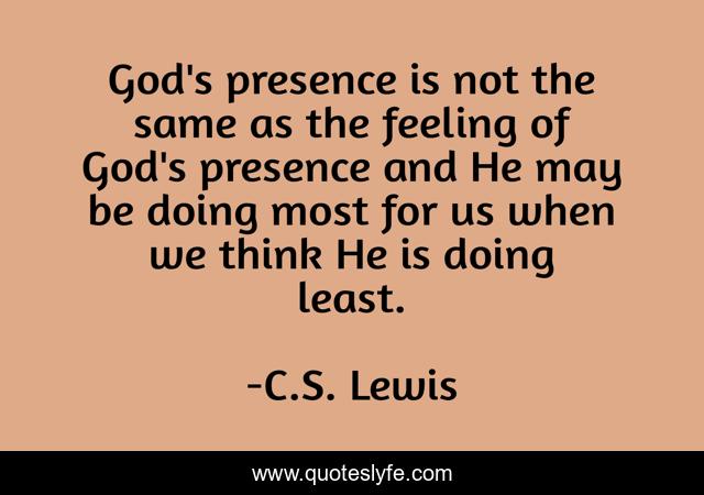 This page presents the quote "God's presence is not the same as the feeling of God's presence and He may be doing most for us when we think He is doing least.". Author of this quote is C.S. Lewis. This quote is about hurting, gods-presence, struggle, christianity,.