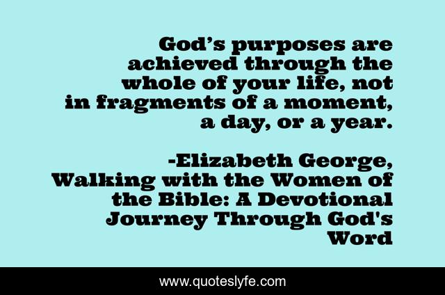 This page presents the quote "God’s purposes are achieved through the whole of your life, not in fragments of a moment, a day, or a year.". Author of this quote is Elizabeth George, Walking with the Women of the Bible: A Devotional Journey Through God's Word. This quote is about women-of-the-bible-godly-women, faith, bible, god, elizabeth-george, purpose, christian-living,.