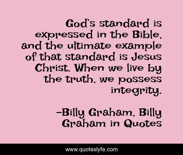 This page presents the quote "God’s standard is expressed in the Bible, and the ultimate example of that standard is Jesus Christ. When we live by the truth, we possess integrity.". Author of this quote is Billy Graham, Billy Graham in Quotes. This quote is about integrity, billy-graham,.