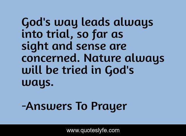 This page presents the quote "God's way leads always into trial, so far as sight and sense are concerned. Nature always will be tried in God's ways.". Author of this quote is Answers To Prayer. This quote is about trial, discipleship,.