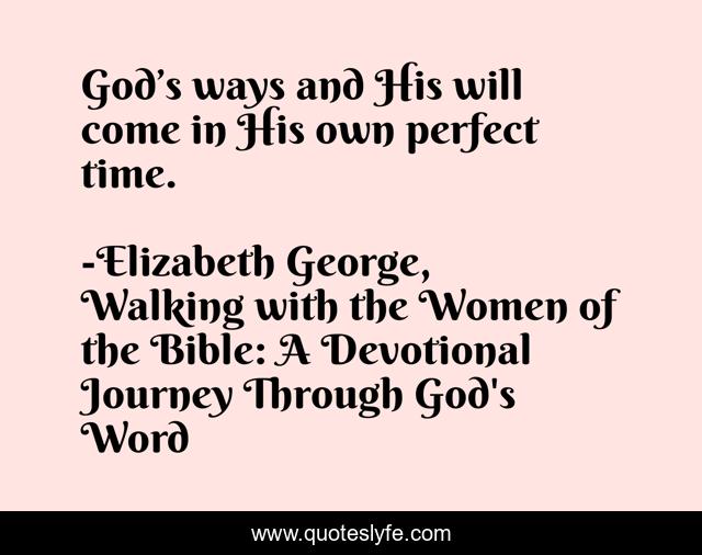This page presents the quote "God’s ways and His will come in His own perfect time.". Author of this quote is Elizabeth George, Walking with the Women of the Bible: A Devotional Journey Through God's Word. This quote is about perfect, own, christian, god, way, time, love, come, affection,.