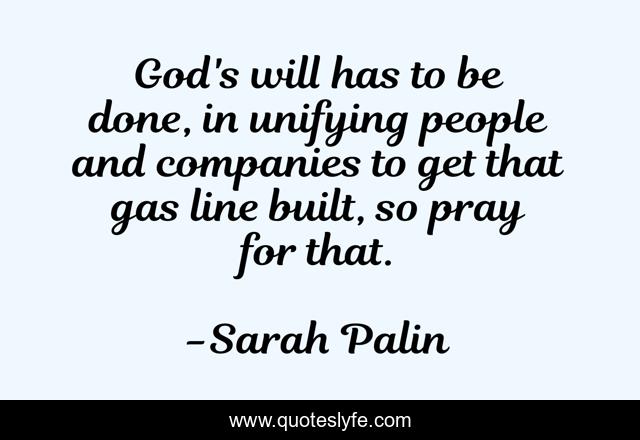 This page presents the quote "God's will has to be done, in unifying people and companies to get that gas line built, so pray for that.". Author of this quote is Sarah Palin. This quote is about god, industry, palinisms, religion, environmental-degradation, prayer, christianity,.