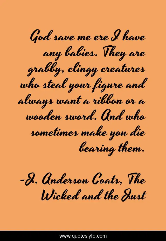 This page presents the quote "God save me ere I have any babies. They are grabby, clingy creatures who steal your figure and always want a ribbon or a wooden sword. And who sometimes make you die bearing them.". Author of this quote is J. Anderson Coats, The Wicked and the Just. This quote is about motherhood, babies,.