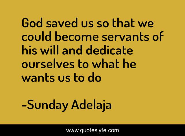 This page presents the quote "God saved us so that we could become servants of his will and dedicate ourselves to what he wants us to do". Author of this quote is Sunday Adelaja. This quote is about god, dedicate, servants, ourselves,.