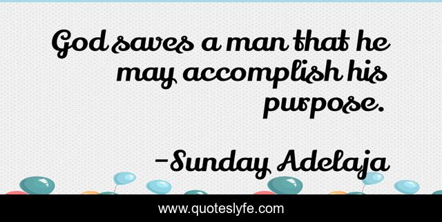 This page presents the quote "God saves a man that he may accomplish his purpose.". Author of this quote is Sunday Adelaja. This quote is about god, accomplish, purpose, man,.