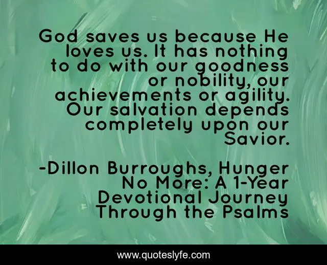 This page presents the quote "God saves us because He loves us. It has nothing to do with our goodness or nobility, our achievements or agility. Our salvation depends completely upon our Savior.". Author of this quote is Dillon Burroughs, Hunger No More: A 1-Year Devotional Journey Through the Psalms. This quote is about salvation, god-s-love, god-s-grace,.