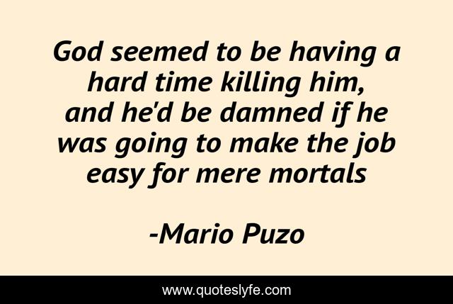This page presents the quote "God seemed to be having a hard time killing him, and he'd be damned if he was going to make the job easy for mere mortals". Author of this quote is Mario Puzo. This quote is about life, mafia, strength,.