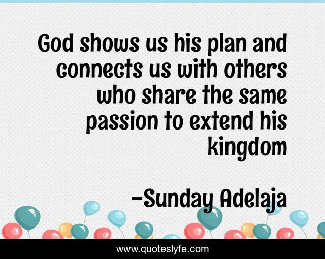 This page presents the quote "God shows us his plan and connects us with others who share the same passion to extend his kingdom". Author of this quote is Sunday Adelaja. This quote is about kingdom, passion, plans, extend,.