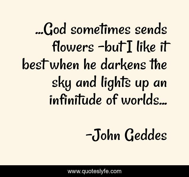 This page presents the quote "...God sometimes sends flowers -but I like it best when he darkens the sky and lights up an infinitude of worlds...". Author of this quote is John Geddes. This quote is about darkens, god, spiritual, flowers, worlds,.