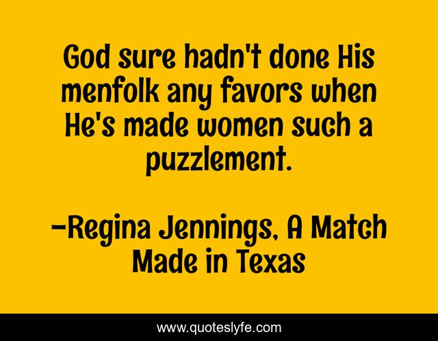 "Regina Jennings, A Match Made in Texas Quotes." Quoteslyfe.com, 2025. Sun. 07 Dec. 2025. <https://www.quoteslyfe.com/quote/God-sure-hadn-t-done-His-menfolk-127900>.