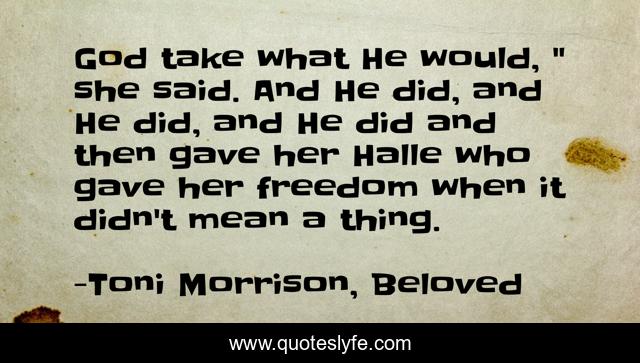 This page presents the quote "God take what He would, " she said. And He did, and He did, and He did and then gave her Halle who gave her freedom when it didn't mean a thing.". Author of this quote is Toni Morrison, Beloved. This quote is about common, freedom, children, god, loss,.