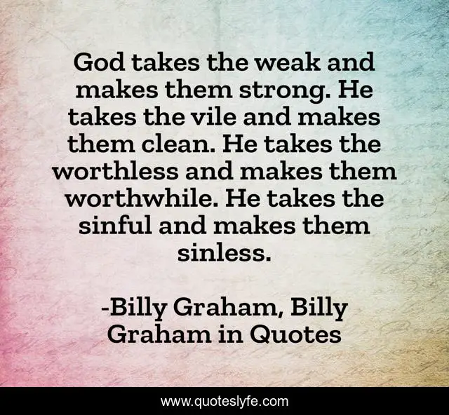 This page presents the quote "God takes the weak and makes them strong. He takes the vile and makes them clean. He takes the worthless and makes them worthwhile. He takes the sinful and makes them sinless.". Author of this quote is Billy Graham, Billy Graham in Quotes. This quote is about strength, billy-graham,.