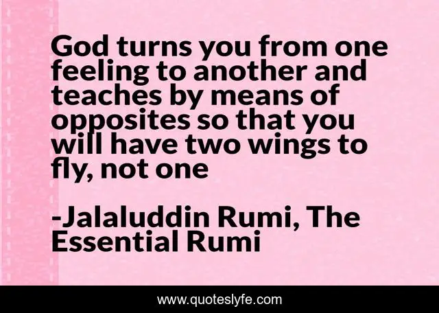 This page presents the quote "God turns you from one feeling to another and teaches by means of opposites so that you will have two wings to fly, not one". Author of this quote is Jalaluddin Rumi, The Essential Rumi. This quote is about faith, love, confusion, inspirational, enthusiasm, affection,.