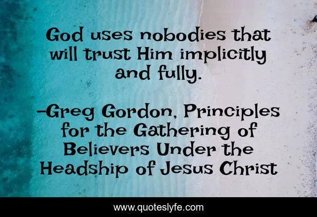 This page presents the quote "God uses nobodies that will trust Him implicitly and fully.". Author of this quote is Greg Gordon, Principles for the Gathering of Believers Under the Headship of Jesus Christ. This quote is about god, trust,.