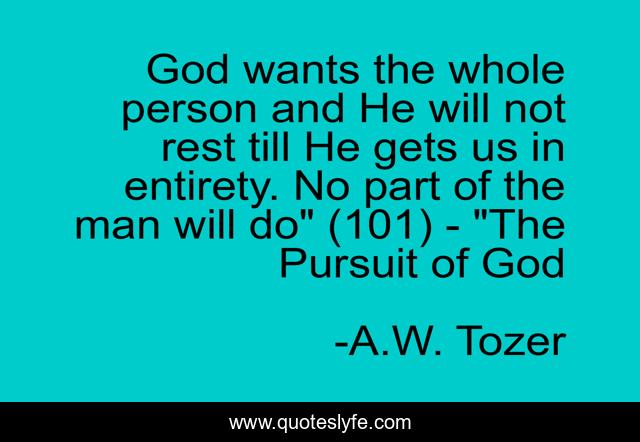 This page presents the quote "God wants the whole person and He will not rest till He gets us in entirety. No part of the man will do" (101) - "The Pursuit of God". Author of this quote is A.W. Tozer. .