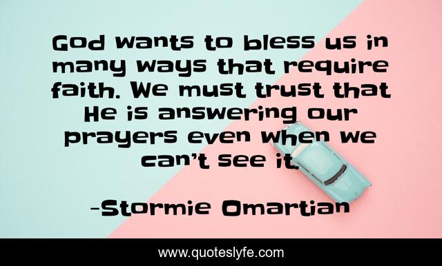 This page presents the quote "God wants to bless us in many ways that require faith. We must trust that He is answering our prayers even when we can’t see it.". Author of this quote is Stormie Omartian. This quote is about motivation, christian, uplifting, powerful, encouraging, encouragement, jesus, spirituality, inspirational,.