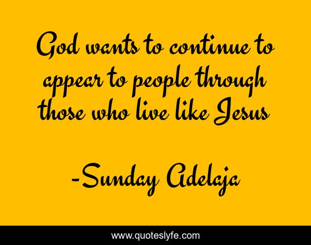 This page presents the quote "God wants to continue to appear to people through those who live like Jesus". Author of this quote is Sunday Adelaja. This quote is about appear, people, national-trans, jesus, live, continue, god,.