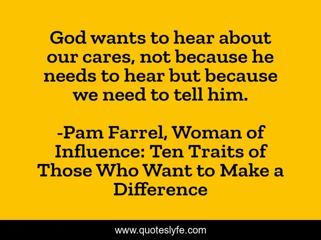 "Pam Farrel, Woman of Influence: Ten Traits of Those Who Want to Make a Difference Quotes." Quoteslyfe.com, 2025. Fri. 05 Dec. 2025. <https://www.quoteslyfe.com/quote/God-wants-to-hear-about-our-cares-114944>.