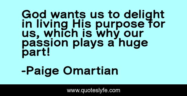 This page presents the quote "God wants us to delight in living His purpose for us, which is why our passion plays a huge part!". Author of this quote is Paige Omartian. This quote is about delight, god, prayer, passion, wake-up,.