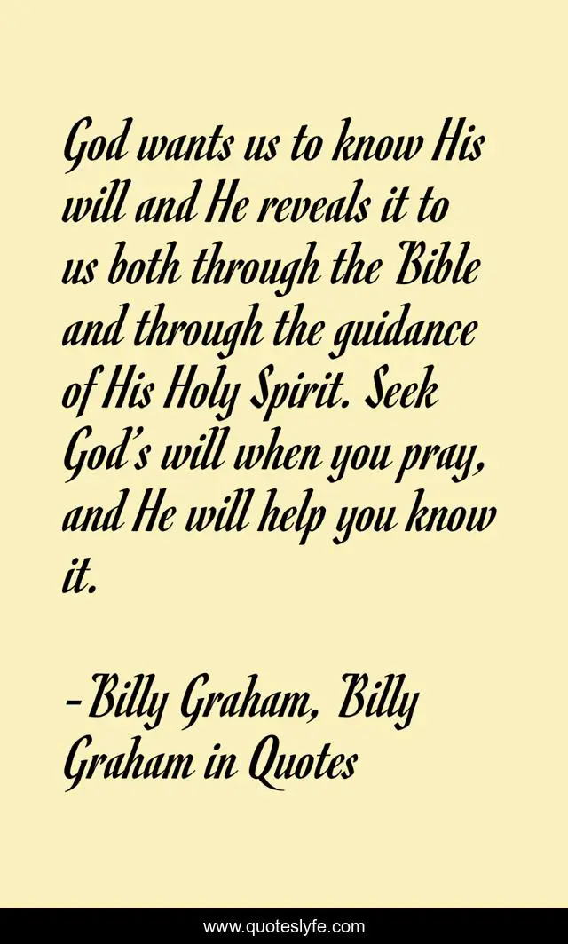 This page presents the quote "God wants us to know His will and He reveals it to us both through the Bible and through the guidance of His Holy Spirit. Seek God’s will when you pray, and He will help you know it.". Author of this quote is Billy Graham, Billy Graham in Quotes. This quote is about god-s-will, billy-graham,.