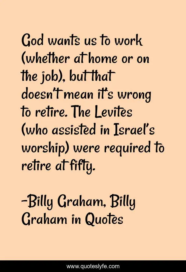 This page presents the quote "God wants us to work (whether at home or on the job), but that doesn’t mean it’s wrong to retire. The Levites (who assisted in Israel’s worship) were required to retire at fifty.". Author of this quote is Billy Graham, Billy Graham in Quotes. This quote is about age, billy-graham,.