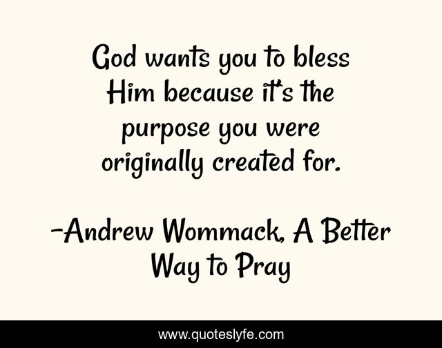 This page presents the quote "God wants you to bless Him because it’s the purpose you were originally created for.". Author of this quote is Andrew Wommack, A Better Way to Pray. This quote is about bless, life, creation, purpose,.