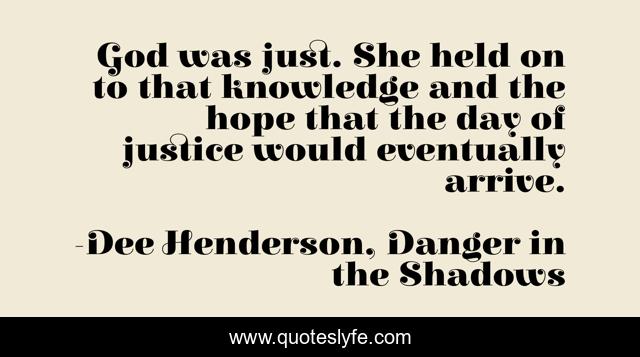 This page presents the quote "God was just. She held on to that knowledge and the hope that the day of justice would eventually arrive.". Author of this quote is Dee Henderson, Danger in the Shadows. This quote is about justice, god, inpirational,.