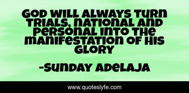 This page presents the quote "God will always turn trials, national and personal into the manifestation of His glory". Author of this quote is Sunday Adelaja. This quote is about glory, personal, god, national, turn, manifestation, trials,.