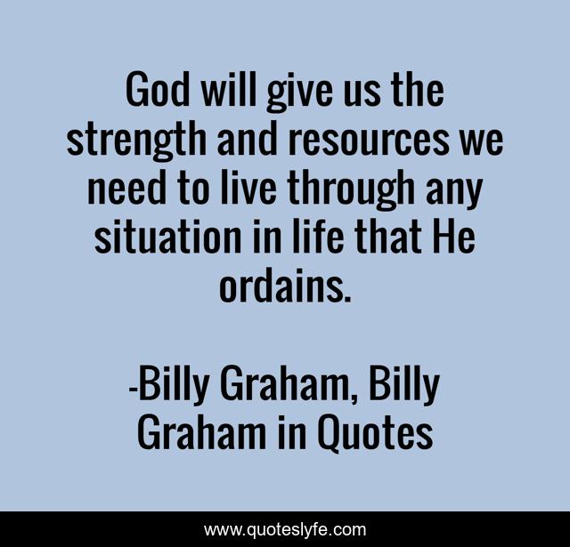 This page presents the quote "God will give us the strength and resources we need to live through any situation in life that He ordains.". Author of this quote is Billy Graham, Billy Graham in Quotes. This quote is about strength, billy-graham,.