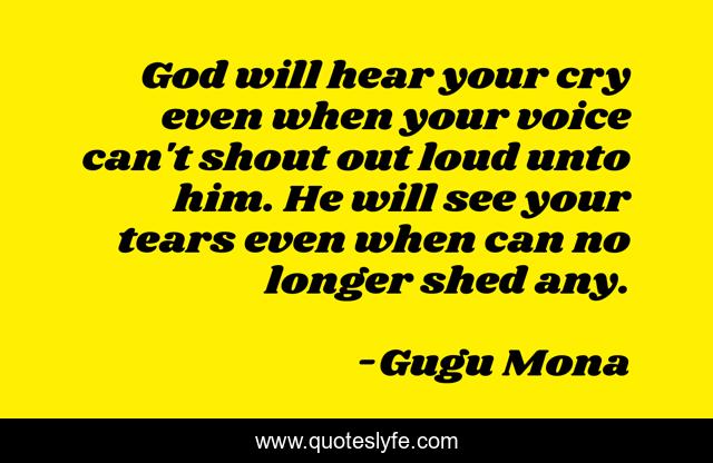 This page presents the quote "God will hear your cry even when your voice can't shout out loud unto him. He will see your tears even when can no longer shed any.". Author of this quote is Gugu Mona. This quote is about shed, god, cry, see, tears, hear, voice,.
