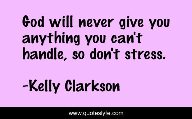 This page presents the quote "God will never give you anything you can't handle, so don't stress.". Author of this quote is Kelly Clarkson. This quote is about faith, inspirations,.
