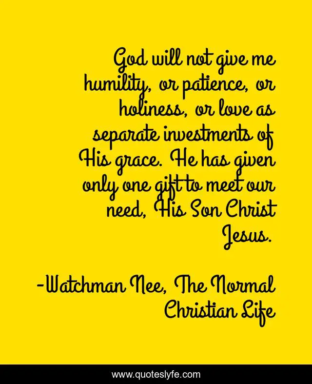 This page presents the quote "God will not give me humility, or patience, or holiness, or love as separate investments of His grace. He has given only one gift to meet our need, His Son Christ Jesus.". Author of this quote is Watchman Nee, The Normal Christian Life. This quote is about discipleship, spiritual-gifts, prayer,.