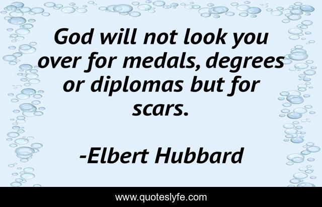 This page presents the quote "God will not look you over for medals, degrees or diplomas but for scars.". Author of this quote is Elbert Hubbard. This quote is about faith, god, wisdom,.