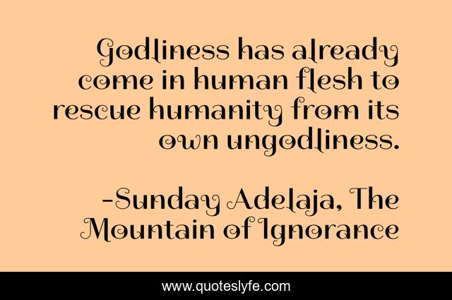 This page presents the quote "Godliness has already come in human flesh to rescue humanity from its own ungodliness.". Author of this quote is Sunday Adelaja, The Mountain of Ignorance. This quote is about mountain, life, darkness, power, danger, god, people, human-flesh, godliness,.