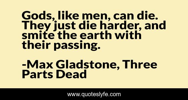 This page presents the quote "Gods, like men, can die. They just die harder, and smite the earth with their passing.". Author of this quote is Max Gladstone, Three Parts Dead. .