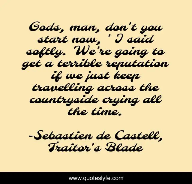 This page presents the quote "Gods, man, don't you start now, ' I said softly. 'We're going to get a terrible reputation if we just keep travelling across the countryside crying all the time.". Author of this quote is Sebastien de Castell, Traitor's Blade. This quote is about emotional, humour, fantasy,.
