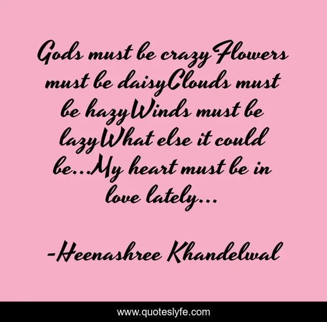 This page presents the quote "Gods must be crazyFlowers must be daisyClouds must be hazyWinds must be lazyWhat else it could be…My heart must be in love lately…". Author of this quote is Heenashree Khandelwal. This quote is about crazy, love, heenashree-khandelwal, heenashree, gods, soulmates, lazy, hazy, daisy,.