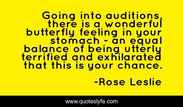 This page presents the quote "Going into auditions, there is a wonderful butterfly feeling in your stomach - an equal balance of being utterly terrified and exhilarated that this is your chance.". Author of this quote is Rose Leslie. This quote is about butterfly, balance, equal,.