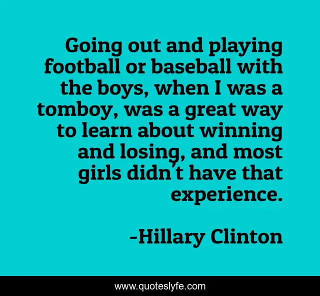 This page presents the quote "Going out and playing football or baseball with the boys, when I was a tomboy, was a great way to learn about winning and losing, and most girls didn't have that experience.". Author of this quote is Hillary Clinton. This quote is about great, football, baseball,.