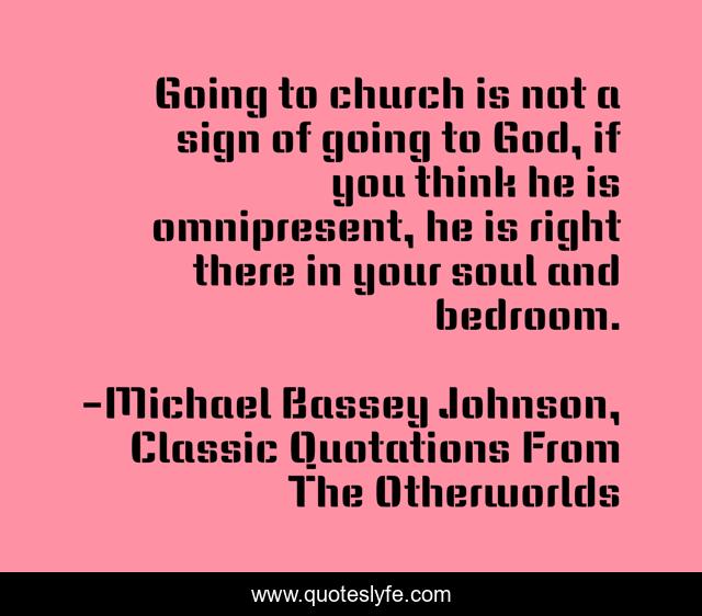 This page presents the quote "Going to church is not a sign of going to God, if you think he is omnipresent, he is right there in your soul and bedroom.". Author of this quote is Michael Bassey Johnson, Classic Quotations From The Otherworlds. This quote is about bedrom, seeking-the-face-the-god, humor, prayers, god, church, soul, sign, unecessary,.