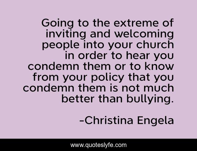This page presents the quote "Going to the extreme of inviting and welcoming people into your church in order to hear you condemn them or to know from your policy that you condemn them is not much better than bullying.". Author of this quote is Christina Engela. This quote is about welcoming, inviting, bullying, church, policy, condemn, extreme,.