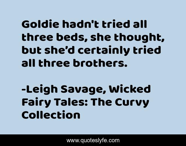 This page presents the quote "Goldie hadn't tried all three beds, she thought, but she’d certainly tried all three brothers.". Author of this quote is Leigh Savage, Wicked Fairy Tales: The Curvy Collection. This quote is about quad-romance, erotica, foursome, romance-erotica, wicked-fairytale,.