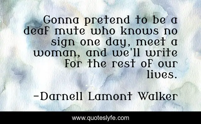 This page presents the quote "Gonna pretend to be a deaf mute who knows no sign one day, meet a woman, and we'll write for the rest of our lives.". Author of this quote is Darnell Lamont Walker. This quote is about write, deaf,.