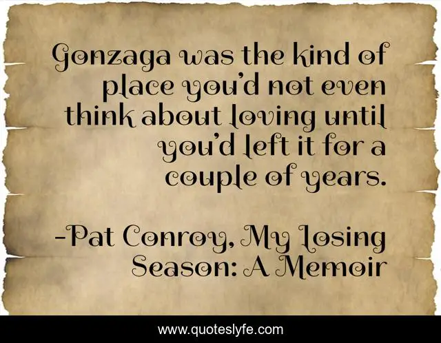 This page presents the quote "Gonzaga was the kind of place you’d not even think about loving until you’d left it for a couple of years.". Author of this quote is Pat Conroy, My Losing Season: A Memoir. This quote is about school, nostalgia, memory,.