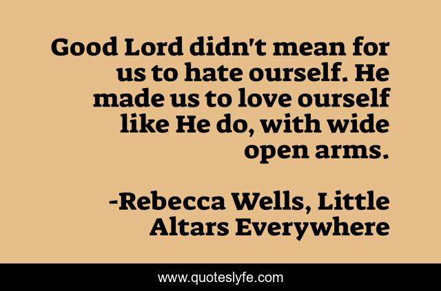 This page presents the quote "Good Lord didn't mean for us to hate ourself. He made us to love ourself like He do, with wide open arms.". Author of this quote is Rebecca Wells, Little Altars Everywhere. This quote is about catholic, worship, depression, god,.