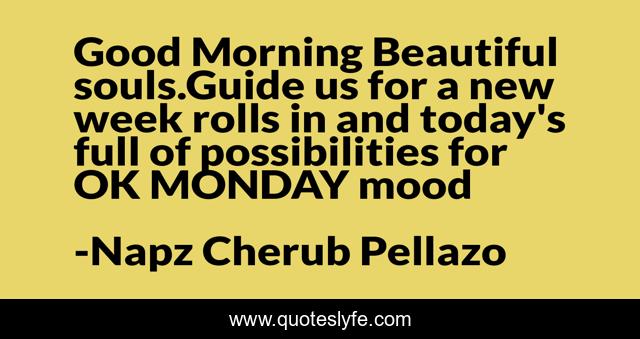 This page presents the quote "Good Morning Beautiful souls.Guide us for a new week rolls in and today's full of possibilities for OK MONDAY mood". Author of this quote is Napz Cherub Pellazo. This quote is about monday-morning, monday, guidance, new-week, good-morning, guide, possibilities, beautiful-souls, full-of-hope,.
