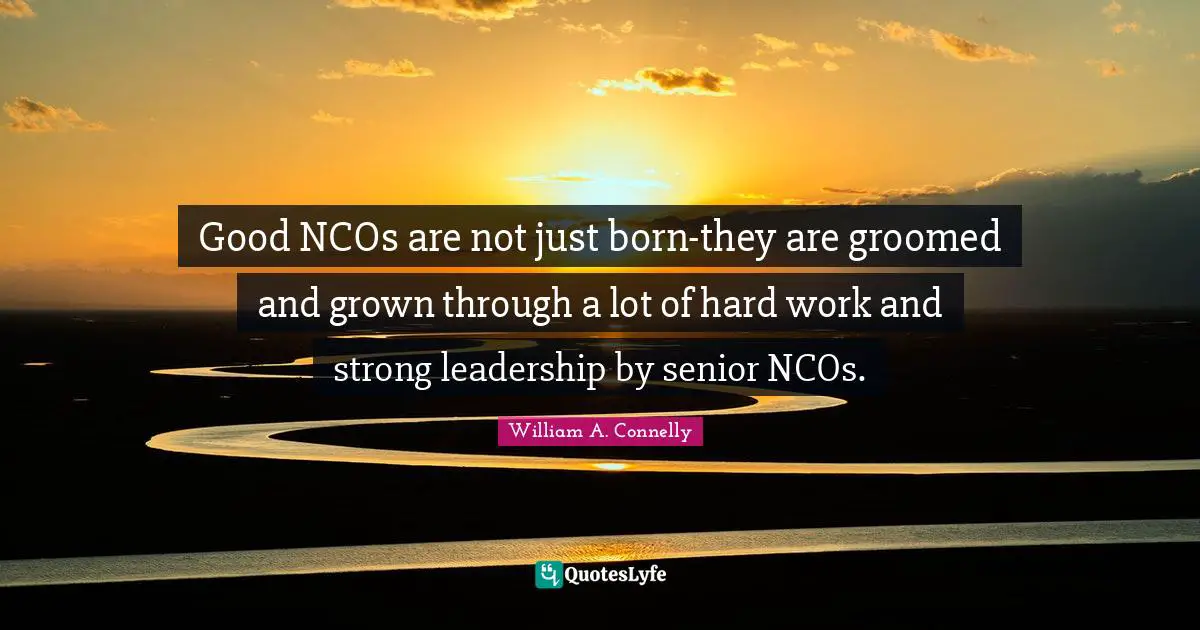This page presents the quote "Good NCOs are not just born-they are groomed and grown through a lot of hard work and strong leadership by senior NCOs.". Author of this quote is William A. Connelly. This quote is about senior, ncos, strong, hard work, born, leadership,.