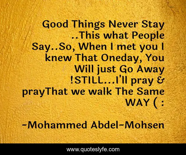 This page presents the quote "Good Things Never Stay ..This what People Say..So, When I met you I knew That Oneday, You Will just Go Away !STILL...I'll pray & prayThat we walk The Same WAY ( :". Author of this quote is Mohammed Abdel-Mohsen. .