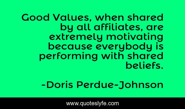 This page presents the quote "Good Values, when shared by all affiliates, are extremely motivating because everybody is performing with shared beliefs.". Author of this quote is Doris Perdue-Johnson. This quote is about values, value,.