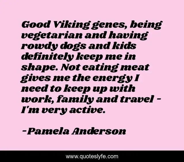 This page presents the quote "Good Viking genes, being vegetarian and having rowdy dogs and kids definitely keep me in shape. Not eating meat gives me the energy I need to keep up with work, family and travel - I'm very active.". Author of this quote is Pamela Anderson. This quote is about work, good, family,.
